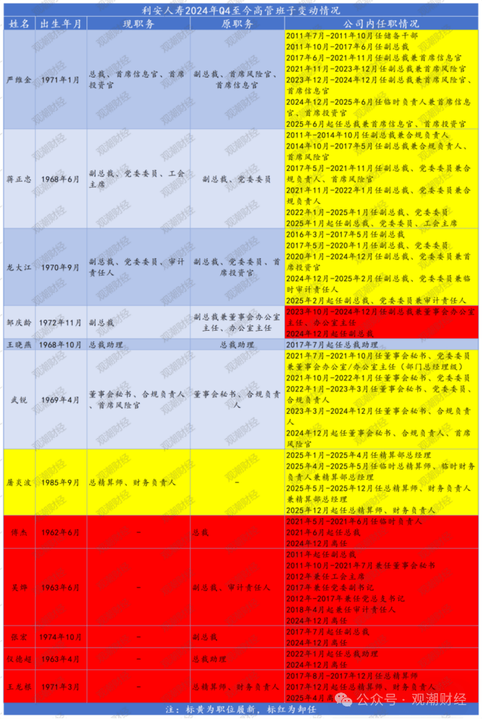 取严维金同期,该公司高管班子大调整。2024岁尾、2025岁首年月,5位高管去职,留任的6名高管(含严维金)中5人职务或职责范畴调整,别的新增一名高管,独一没有调整的高管为王晓燕。王晓燕具有太保寿险、华泰人寿、光大永明人寿等多家险企分支机构从业履历,2012年插手利安人寿后任支公司担任人,后逐渐升任分公司担任人,并自2017年起头进入总公司班子任职至今。女,1968年10月生。曾任常州市钟楼区打算经济委员会科员;承平寿常州分公司停业区督导、武进核心支公司副总司理、营销本部副总司理;华泰人寿常州核心支公司总司理;光大永明人寿姑苏分公司总司理。2012年4月起先后任利安人寿常州分公司总司理;利安人寿总裁帮理兼常州分公司总司理、河南分公司总司理。2017年7月起任利安人寿总裁帮理。男,1985年9月生。曾正在安然财险浙江分公司工做;曾任信泰人寿产物精算部企划精算岗、产物订价室及市场室从任;君康安全经纪产物市场部担任人;财信吉利人寿产物精算部副总司理(掌管工做)、产物精算部总司理兼精算姑且担任人、个险营业部副总司理。2025年1月起先后任利安人寿精算部总司理;姑且总精算师、姑且财政担任人兼精算部总司理;利安人寿总精算师、财政担任人兼精算部总司理。2025年12月起任利安人寿总精算师、财政担任人。职务或职责范畴呈现调整的高管包罗(现职务):副总裁蒋正忠、龙大江,总帮邹庆龄,董秘武锐。此四位高管中,有职务分出的,也有新增职务的。女,1972年11月生。曾正在南京建工工做;曾任生命人寿江苏分公司银保部次要担任人;阳光人寿江苏分公司银保部总司理。2011年5月起先后任利安人寿储蓄干部;利安人寿银行安全部副总司理、集体营业部副总司理(掌管工做)、集体营业部总司理兼淮安分公司总司理、江苏分公司副总司理;集体营业部总司理兼健康险事业部总司理;集体营业总监兼集体营业部总司理、健康险事业部总司理兼河南分公司姑且担任人;董事会办公室从任兼办公室从任(总监级);副总裁兼董事会办公室从任、办公室从任。2024年12月起任利安人寿副总裁。蒋正忠增任工会;副总裁、党委委员龙大江姑且审计义务人职位转正;董事会秘书、合规担任人武锐增任首席风险官。蒋正忠:男,1968年6月生。曾任江苏省计生委工做人事处副从任科员、人事处从任科员、副处长;江苏保监局人身安全监管处副处长(掌管工做);江苏保监局人身安全监管处处长。2011年起先后任利安人寿副总裁兼合规担任人;副总裁兼合规担任人、首席风险官兼江苏分公司姑且担任人;副总裁、党委委员兼合规担任人、首席风险官;副总裁、党委委员兼合规担任人;副总裁、党委委员。2025年1月起任副总裁、党委委员、工会。男,1970年9月生。曾任安徽林业厅副从任科员;中国人寿安徽分公司营销部副司理,合肥分公司营销部司理、中介部司理,淮南分公司副总司理,淮南分公司党委、总司理,安徽分公司银行安全部总司理。2013年-2016年历任利安人寿安徽分公司筹建担任人,安徽分公司总司理、党总支;2016年3月起先后任利安人寿副总裁;副总裁、党委委员兼山东分公司总司理;副总裁、党委委员、首席投资官兼投资办理部总司理;副总裁、党委委员兼姑且审计义务人。2025年2月起任副总裁、党委委员兼审计义务人。男,1969年4月生。曾正在安徽淮南石油公司工做;曾任淮南结合大学经济系、办公室从任;安然人寿安徽分公司客服部司理、蚌埠核心支公司司理;曾参取设立利安人寿的前期调研工做;国元农险财富安全部总司理。2010年10月参取设立利安人寿的筹备工做,任利安人寿储蓄干部;董事会办公室/办公室从任(部分总司理级);董事会办公室/办公室从任(部分总司理级)、党委委员;董事会秘书、党委委员兼董事会办公室/办公室从任(部分总司理级);董事会秘书、党委委员;董事会秘书、党委委员、合规担任人;董事会秘书、合规担任人。2024年12月起任董事会秘书、合规担任人、首席风险官。2024年12月以来,除上述高管新增职务,还有5位高管离任,此中包罗已超期服役的原总裁傅杰,62岁卸下沉担;别的还有两位到退休春秋的高管:副总裁、审计义务人吴烨,总帮仪德超。此外,卸任的高管还包罗原副总裁张宏,原总精算师、财政担任人王龙根。目前,利安人寿整个高管团队焕新告一段落,新的高管团队大多由晚期便插手利安的“老资历”构成。将来,这一深谙利安文化的办理班子将向着公司新的计谋方针勤奋。利安人寿是一家出格的险企,虽从成立初期国有股份高占比,但长达10年时间一曲是平易近营从导,曲至近年才实正实现国有节制。正在汗青创始地位、特殊股权布局下的好处均衡、可能存正在的现性节制以及特按期间的监管配合感化下,利安人寿股权布局中虽包含大量国有本钱,雨润也并非该公司概况上的最大股东,但雨润集团焦点创始人及现实节制人祝义财持久担任利安人寿董事长。利安人寿成立于2011年7月,是经监管核准设立的一家人身安全公司。其初始股东由江苏信任(12%)、凤凰出书传媒集团(11%)、江苏交控(10%)、汇鸿集团(10%)、紫金投控(10%,现名紫金投资集团)等5家国有大型企业和雨润食物集团(20%)、远东控股(13%)、红豆集团(7%)、月星集团(7%)等4家平易近营企业构成,初始注册本钱为10亿元。从股权布局来看,彼时国资持股合计持股53%;单一大