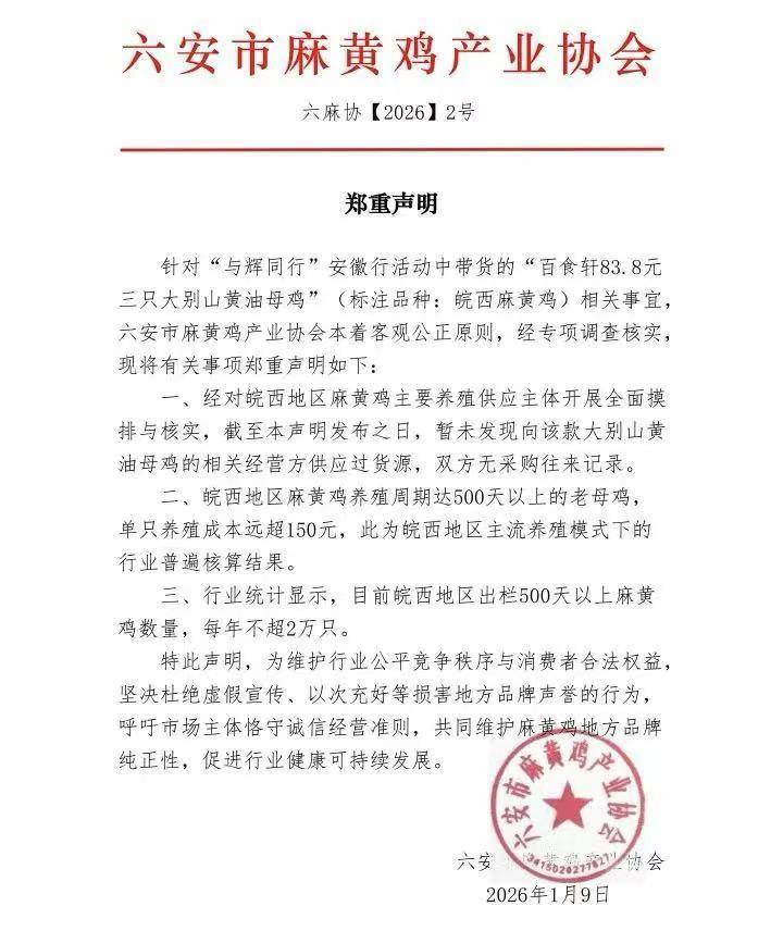 近日,安徽省六安市麻黄鸡财产协会的一纸声明将董宇辉及其曲播团队“取辉同业”推至风口浪尖。此前该协会称,“取辉同业”带货百食轩一款83。8元三只母鸡的产物系麻黄鸡,但皖西地域麻黄鸡次要养殖供应从体均未向该产物相关运营方供应过货源。