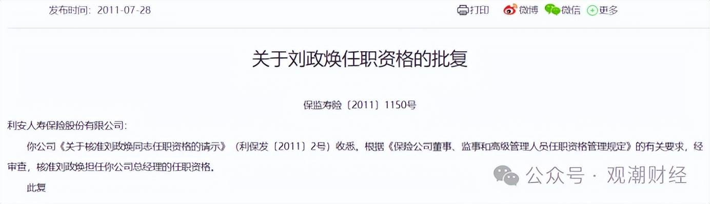 陪伴节制权、股权变动,利安人寿的“一二把手”生变,业绩也随之展示出较大变化。据不雅潮财经梳理,该公司成立以来共履历两个大的阶段:平易近营从导期、国资从导期,历经3位董事长和3位总司理。利安人寿首任董事长祝义财(别名祝义才、祝义材),其正在2010年该公司筹建之时便为拟任董事长兼总司理。2011年7月,利安人寿获批成立,祝义财董事长任职资历获批。