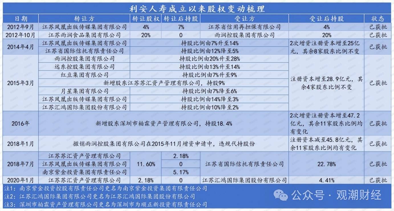 至此,利安人寿国有股东合计持股50。82%,平易近营股东合计持股49。18%,国有持股比例再次跨越平易近营股东,成为节制股东。此后2020年1月,苏汇资产办理向其控股子公司汇鸿集团让渡1亿股利安人寿股份(占比2。18%)。让渡后,汇鸿集团持股比例从2。23%上升至4。41%;苏汇资产办理不再持有益安人寿股份。此次让渡虽未改变国有股东的合计持股环境,但进一步强化了国资控股,此后该股权布局一曲维持至今。