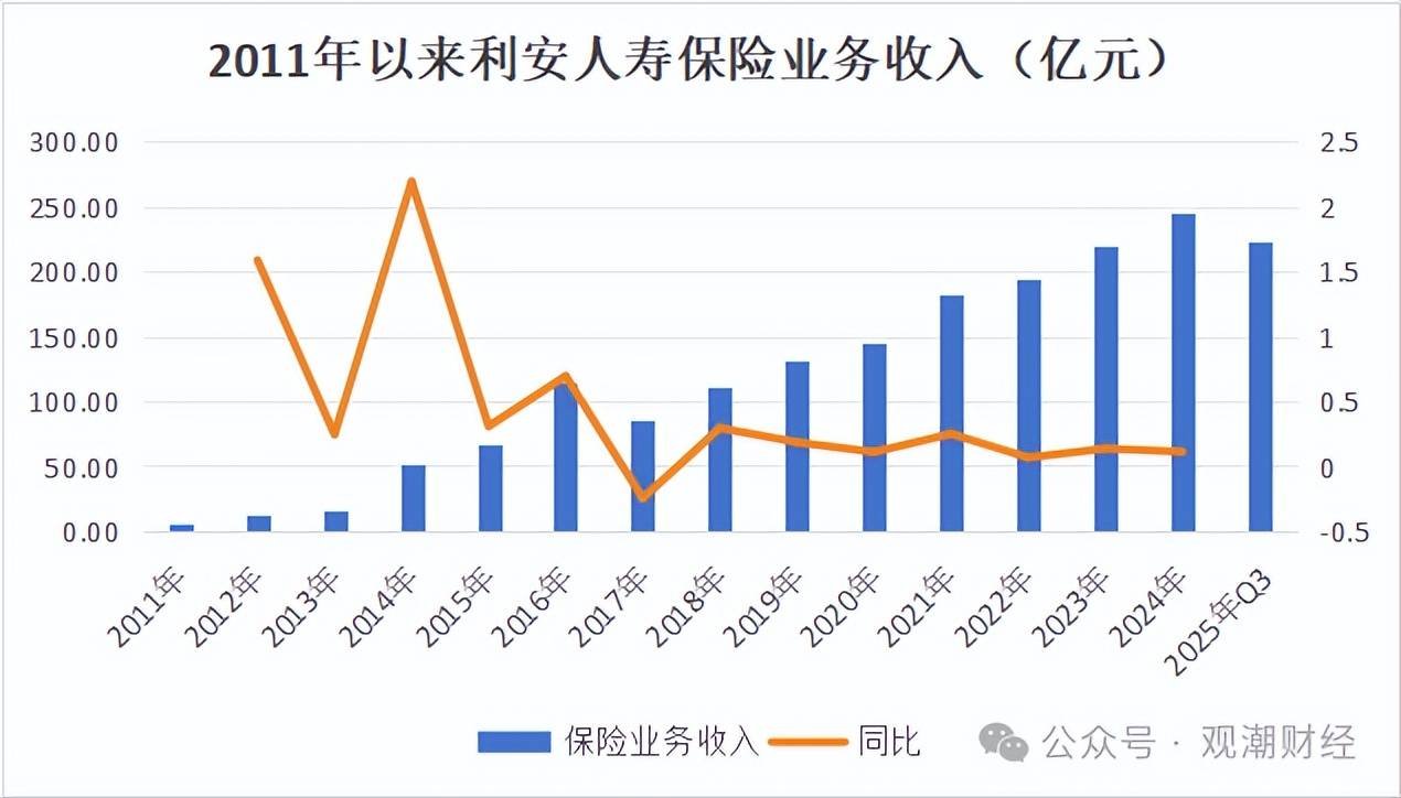 从收入端来看,利安人寿安全营业收入除2017年下降24。8%至85。75亿元,其余年度均同比上升。2024年,该公司安全营业收入为244。57亿元,同比上升11。09%。2025年Q3,该公司安全营业收入为222。77亿元,不出不测,2025年全年保费收入将继续增加。
