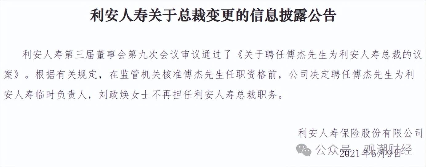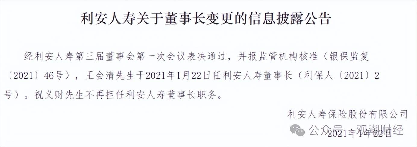 2021年1月,利安人寿发布董事长变动通知布告称,王会清于2021年1月22日任利安人寿董事长,同年6月,该公司聘用傅杰为姑且担任人,刘政焕不再担任利安人寿总裁职务。其取祝义财是目前为止正在任时间最长的总裁、董事长。