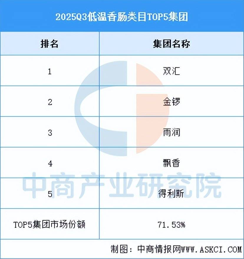 2025Q3,低温腊肠类目TOP5集团别离为双汇、金锣、雨润、飘喷鼻和得利斯,市场份额合计71。53%,集中度较高但较上个季度有环比轻细下降。