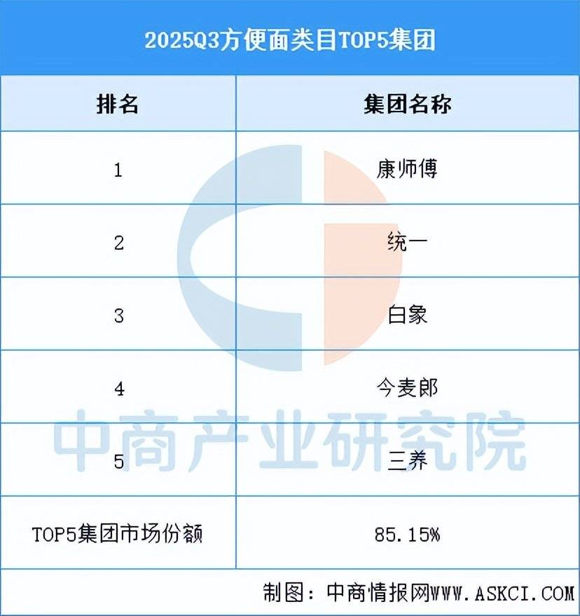 从部门沉点类目正在2025Q3的表示来看,便利面仍然是便利速食类目中的支柱,占比达45。38%,接近市场的一半。第二梯队的常温火腿肠、低温腊肠正在2025Q3的占比别离为18。17%和11。78%,均连结小幅同比增加。其次别离为速食粥、螺蛳粉、午餐肉、酸辣粉,占比别离为6。26%、2。35%、1。28%、1。21%。便利面类目标前五集团由康师傅、同一、白象、今麦郎和三养构成,市场份额合计85。15%,市场集中度高且比拟上个季度有所提拔。