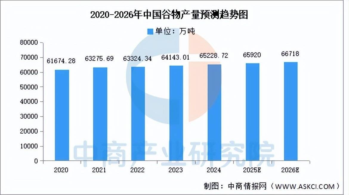 近年来,中国谷物产量全体维持正在60000万吨以上,呈现不变增加趋向。中商财产研究院发布的《2025-2030年中国农产物财产深度阐发及财产成长风险研究预测演讲》显示,2024年中国谷物产量65229万吨,比2023年添加1086万吨,增加1。7%。中商财产研究院阐发师预测,2025年中国谷物产量将继续增加至65920万吨,2026年将达66718万吨。