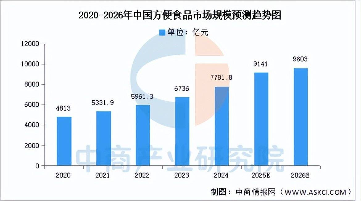 近年来,从保守的便利面到立异型预制菜、调味面成品,便利食物凭仗便利性和多样性正在我国兴旺成长,成为老苍生日常糊口中不成获缺的美食。中商财产研究院发布的《2025-2030年中国便利食物业深度阐发及成长前景预测演讲》显示,2023年中国便利食物市场规模达到6736亿元,近五年年均复合增加率达10。6%,2024年约为7781。8亿元。中商财产研究院阐发师预测,2025年中国便利食物市场规模将达到9141亿元,2026年市场规模将进一步增加至9603亿元。